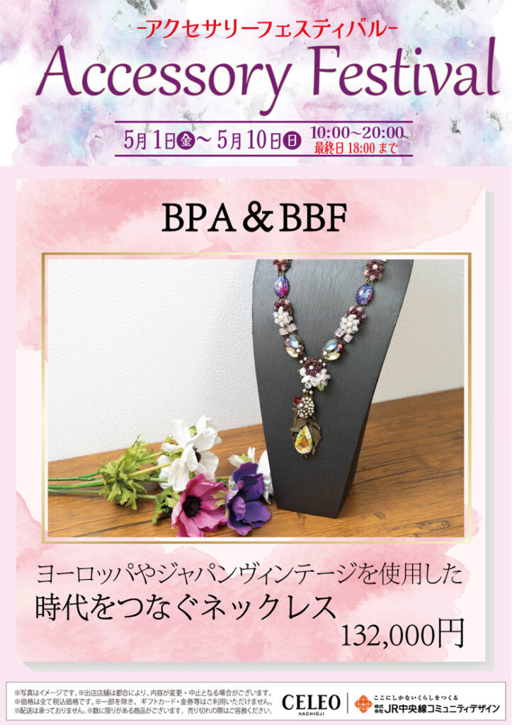 渡辺志保主催のビジュードパルレアクセサリー協会(通称BPA)と、青木恵理のグループBBFがサレオ八王子に2026年5月1日(金)~10日(日)の「アクセサリーフェスティバル」に出展します!